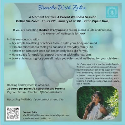 A Moment for ME, is a 1.5-hour online Wellness session for parents of children of all ages, offering practical breathing and mindfulness tools to support your own wellbeing.