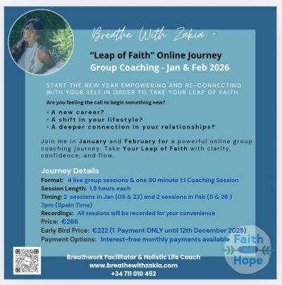 Online - Zoom , Spainđź’«Are you feeling the call to begin something new? Whether it’s a fresh chapter in your career, a shift in your lifestyle, or a deeper connection in your relationships? This January and February 2026, I invite you to a powerful online group coaching journey to support you in taking a leap of faith with clarity, confidence, and flow. […]